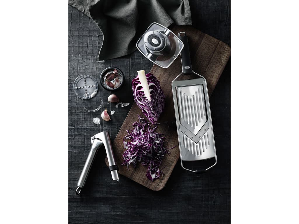Þetta mandólín frá Rösle er með ótrúlega beittum V-laga skera, sem ræður við allt hráefni sem vanalega er notað í mandólín.