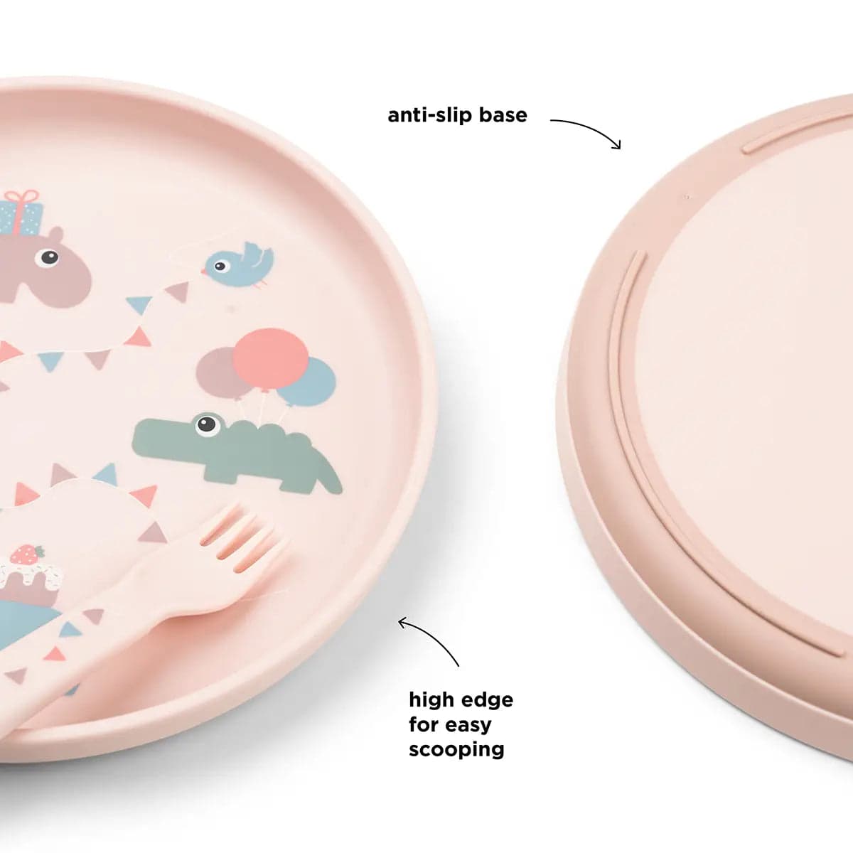 Þetta fallega Foodie matarsett er fullkomið til að gera hverja máltíð skemmtileg. Diskurinn hefur praktíska rennihindrun á botninum til að tryggja stöðugan máltíðaupplifun. Þetta er frábær gjafahugmynd sem bætir skemmtilegu ívafi við hverja máltíð. Settið má setja í örbylgjuofni og uppþvottavél, og er laust við BPA og. phthalates, sem gerir það öruggt val fyrir litla fólkið.
