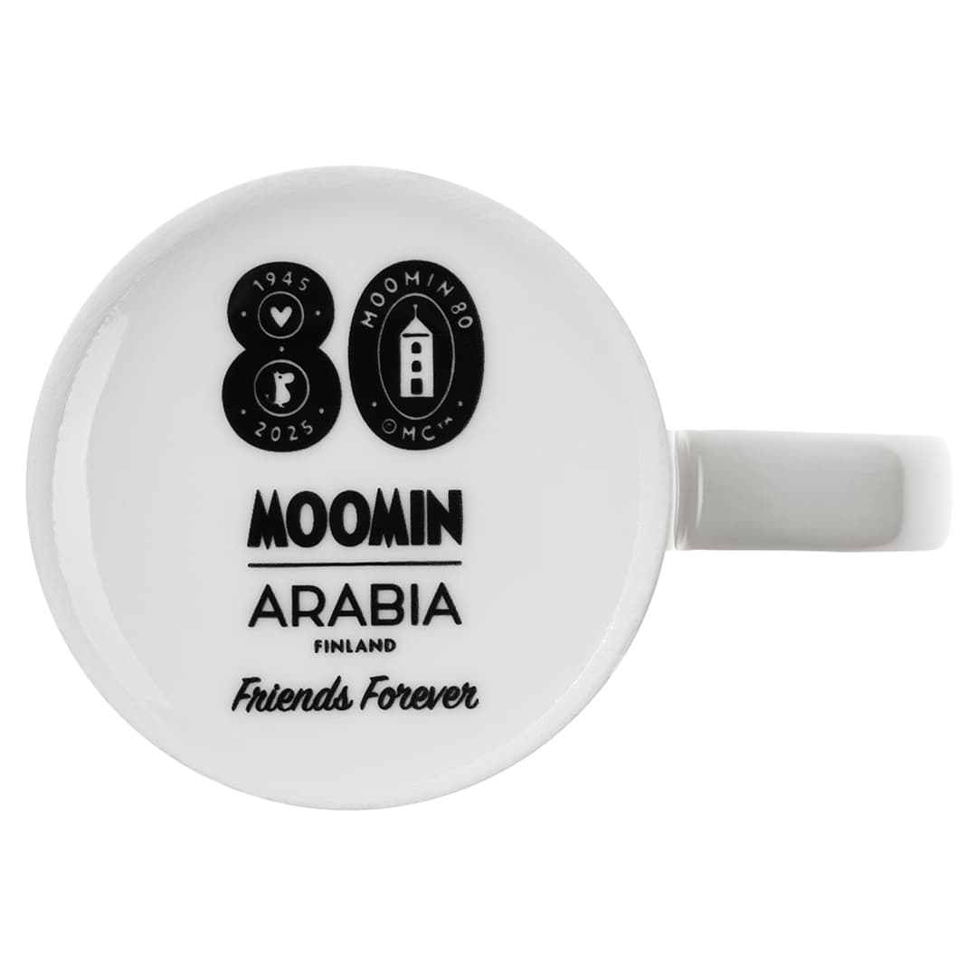 Þessi krús er úr Friends Forever línunni frá Moomin by Arabia. Línan inniheldur krús, skálar, diska, bakka, könnu, krukku, sængurföt, handklæði og margt fleira. Myndskreyting er í fallegum mildum litum og sýnir vinina, Múmínsnáða, Míu litlu og Snúð leggja af stað í skemmtilegt ævintýri.
