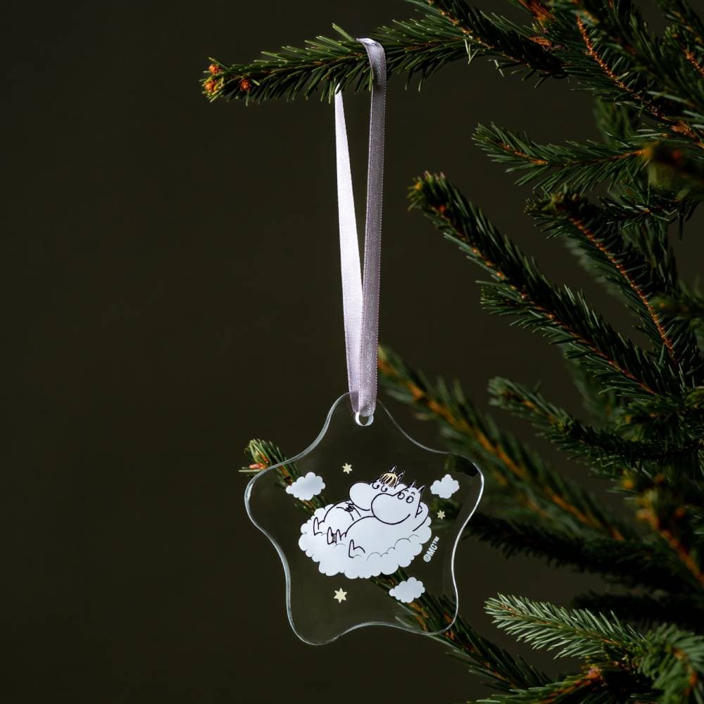 Skreyttu heimilið með smávegis af jólatöfrum Múmíndalsins! Múmínglerskrautin eru fullkomin til að hengja á jólatréð eða í gluggann. Glerskrautin eru flöt og með slípuðum brúnum. Satínborði fylgir með.