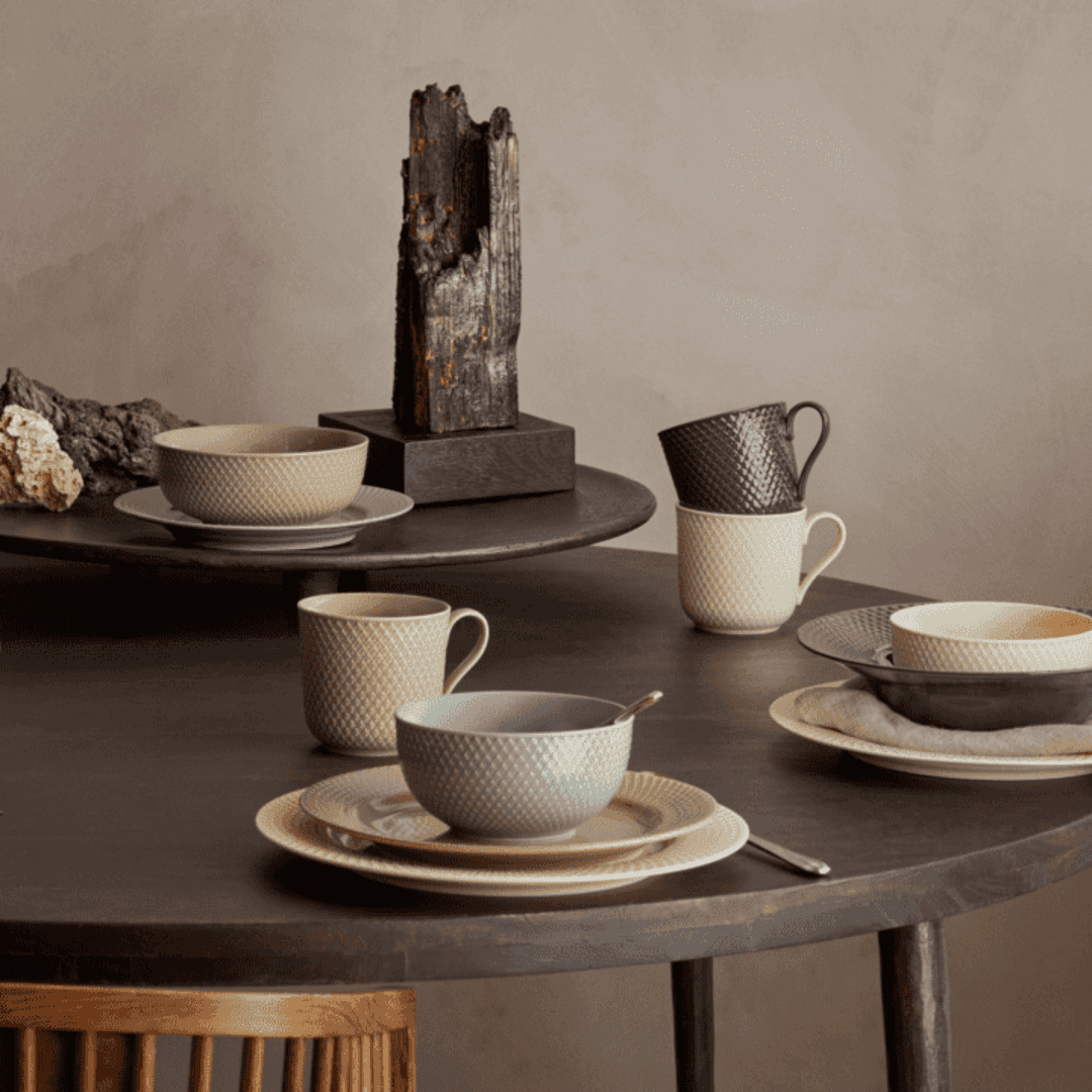 Stellið er í senn ákaflega fallegt og stílhreint.  Rhombe Earth stellið gefur borðinu hlýju og jarðtengingu. Með sínu fallega litavali af fjórum glæsilegum jarðlitum fellur stellið einstaklega vel með inn í Rhombe Color safnið þitt og/eða blandast fallega við klassíska hvítu Rhombe leirtauið, þar sem gráir og brúnir tónar úr Rhombe Earth skapa nútímalega og afslappaða stemningu, í fallegu jafnvægi við hvíta postulínið