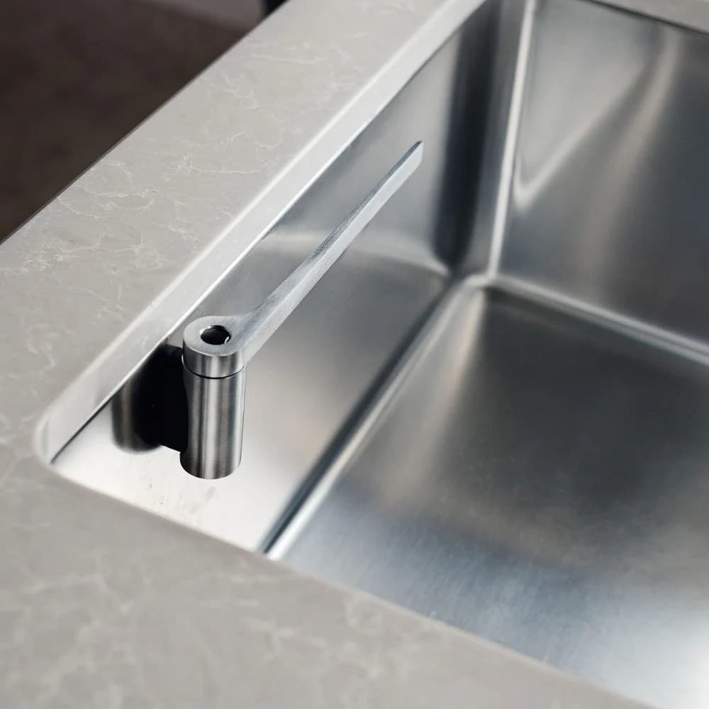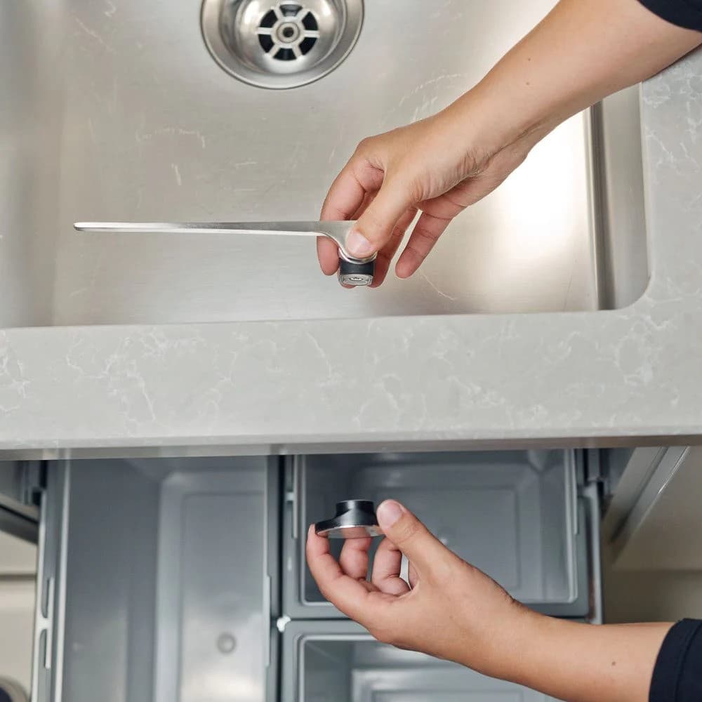 Tuskuslá með segli frá Magisso. Loksins komin lausn á því hvar best sé að geyma eldhústuskuna. Sláin er úr ryðfríu stáli og festist bæði í ferkantaða og hringlótta vaska.