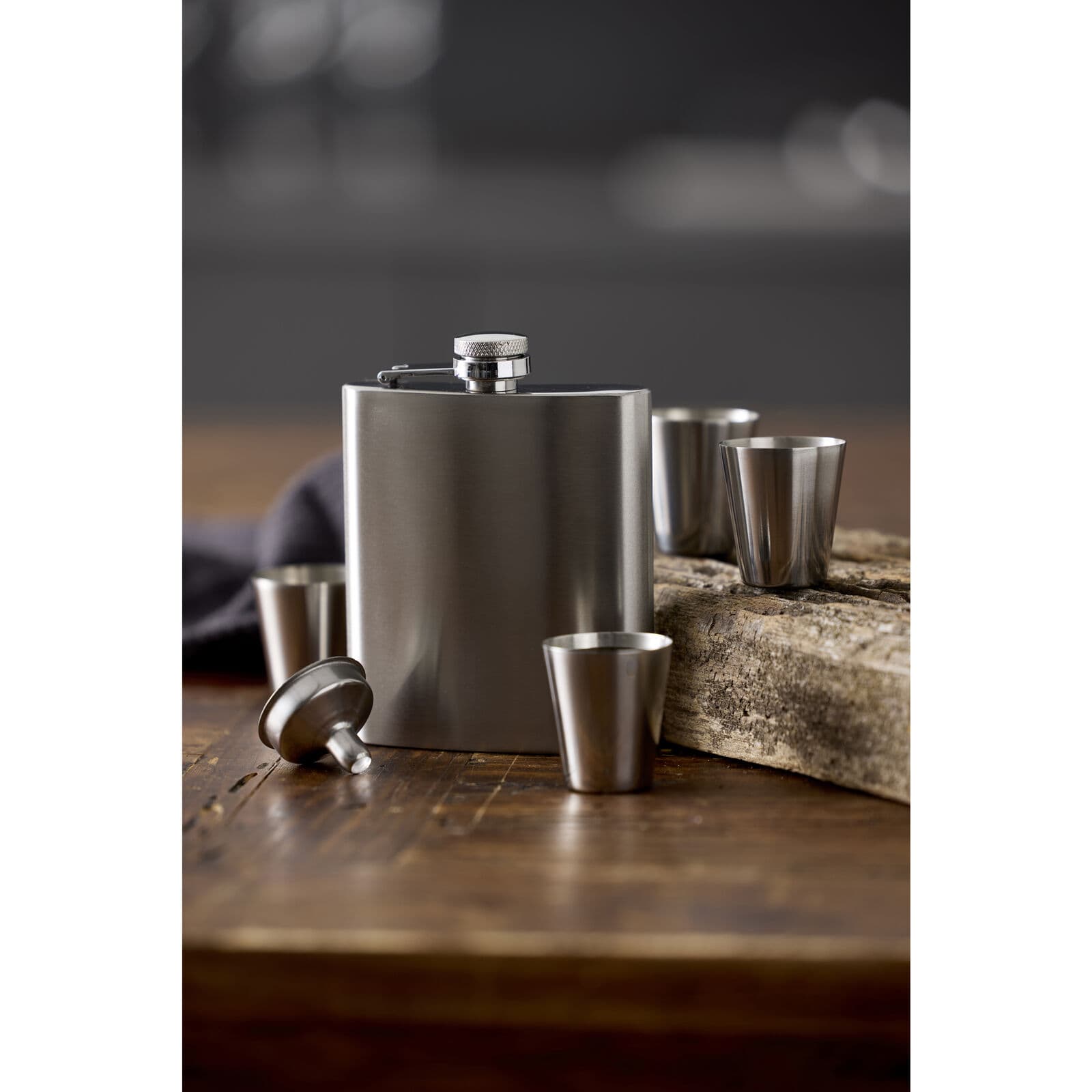 Praktískt og stílhreint sett úr ryðfríu stáli með mattri áferð. Fullkomið sett fyrir veiði eða ferðalögin. Settið inniheldur 200 ml pela og fjögur 30 ml glös og trekt.
