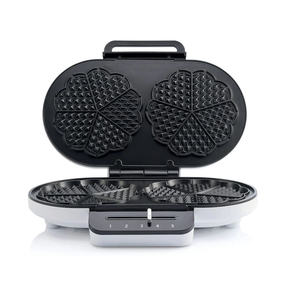 Vöfflujárnið er með tveimur vöffluplötum og er hver vöffluplata er 16 cm í þvermál og bakar hvor þeirra 5 vöffluhjörtu í einu.